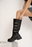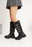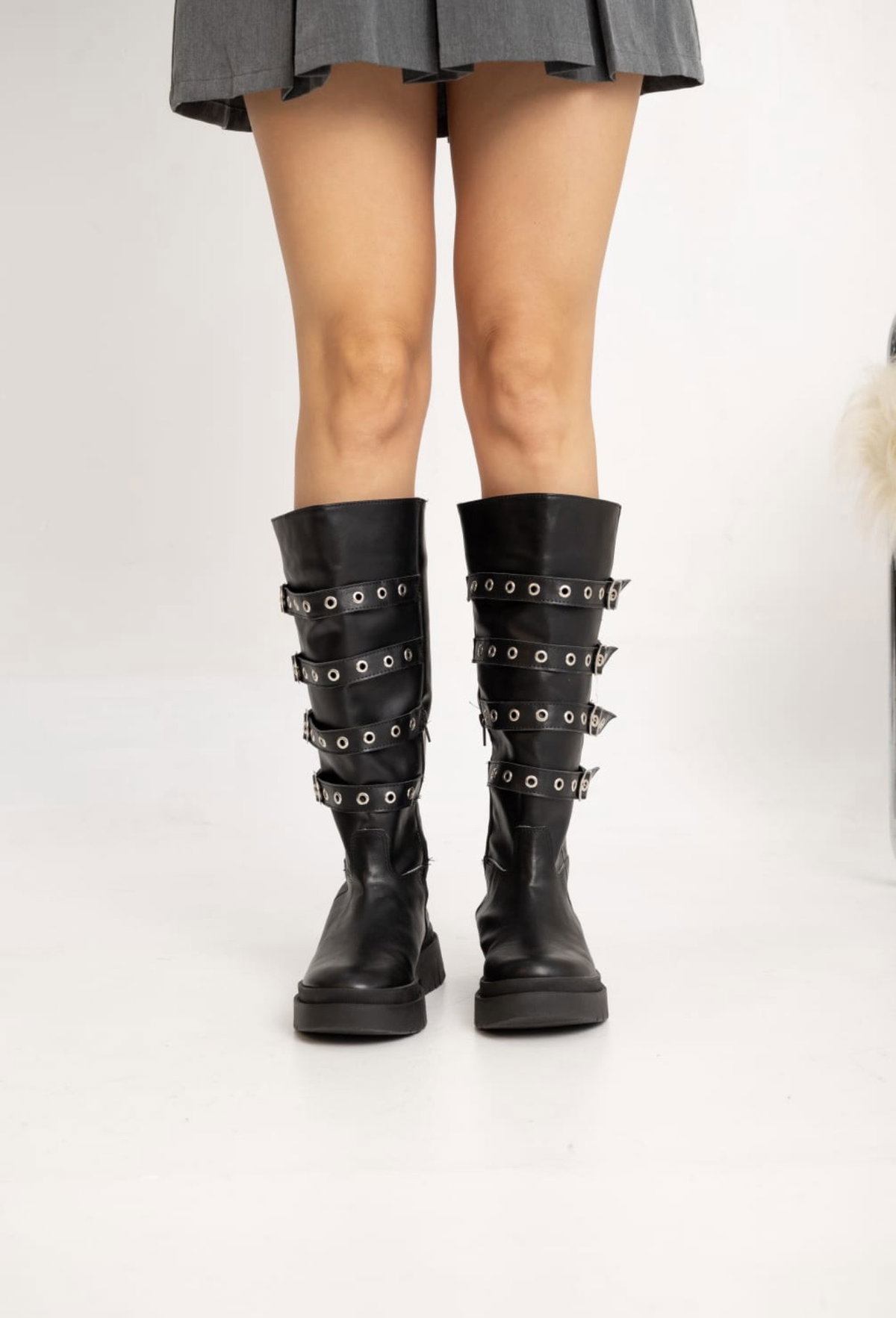 Su diseño con tiras y hebillas recorre toda la caña, logrando un efecto visual fuerte que transforma cualquier outfit en un look protagonista.