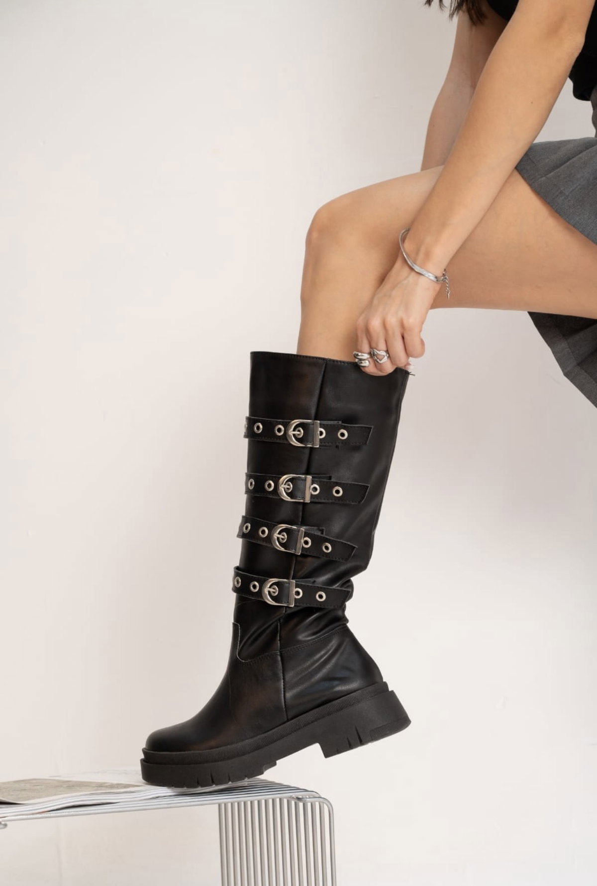 Bota caña alta de estilo biker con múltiples hebillas y apliques metálicos, ideal para un look más jugado y con mucha personalidad. Confeccionada en material tipo cuero, cuenta con cierre lateral que facilita el calce y suela chunky que aporta altura, agarre y comodidad.