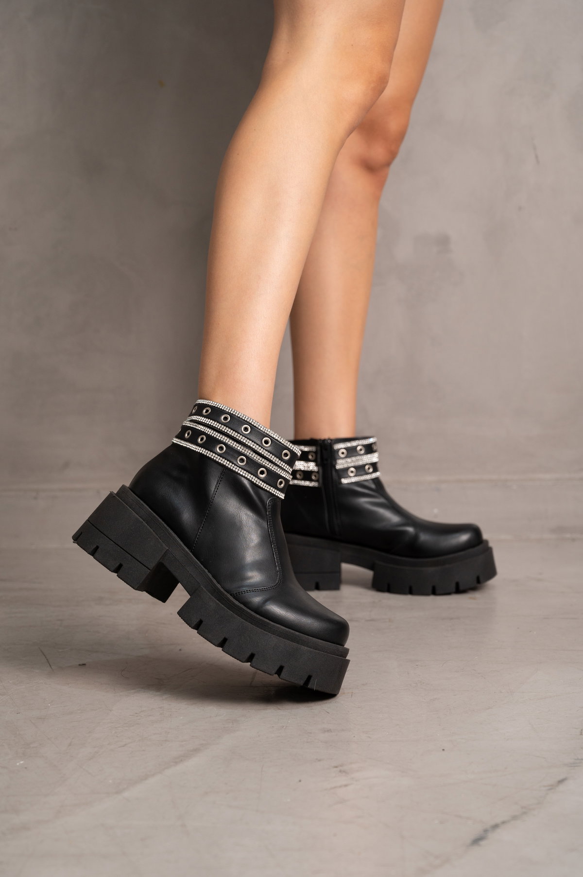 Bota corta de estilo urbano con detalle de tachas y apliques metálicos en la caña, ideal para sumar un toque más jugado al look. Confeccionada en material tipo cuero, cuenta con cierre lateral para un calce práctico y suela chunky que aporta altura, agarre y comodidad al caminar.