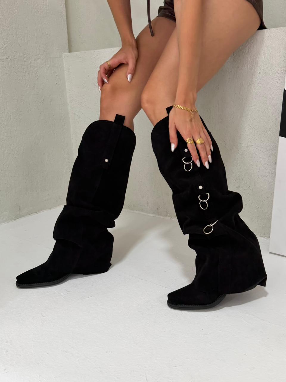 Bota caña alta con caída relajada, un modelo que destaca por su estilo y personalidad.