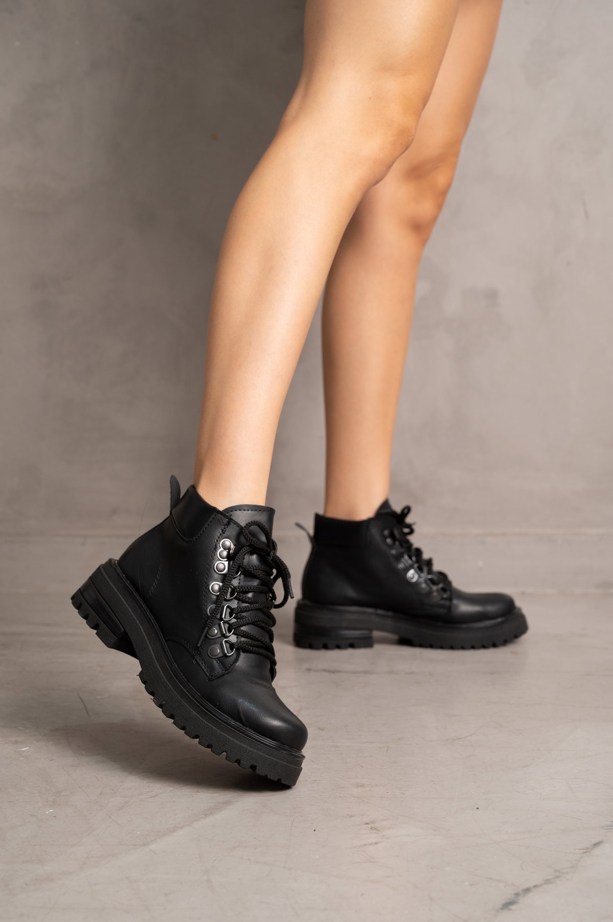 Borcego corto de estilo clásico con cordones, ideal para el uso diario. Confeccionado en material tipo cuero, cuenta con suela dentada que aporta buen agarre y estabilidad al caminar.