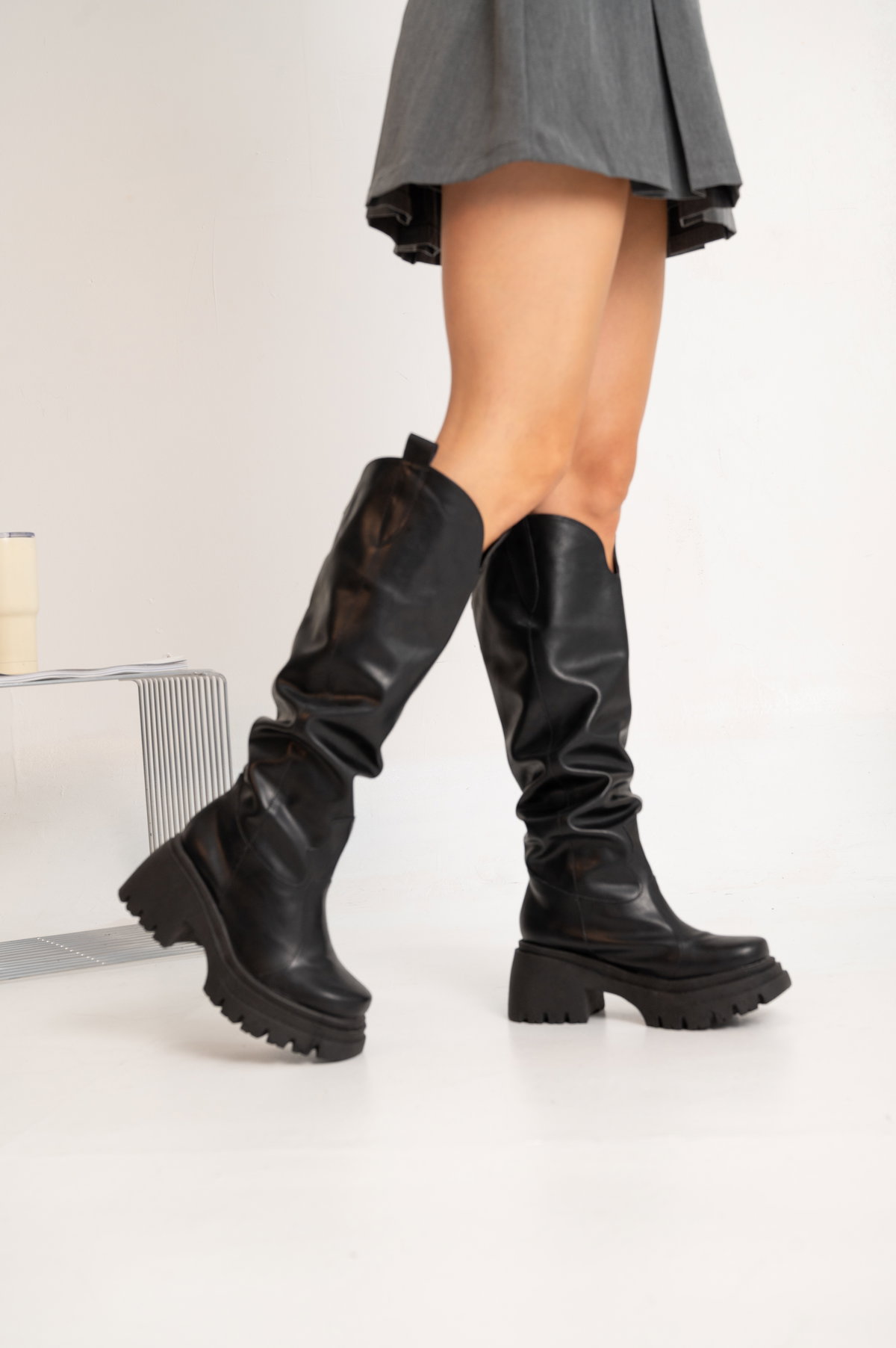 Bota caña alta de diseño moderno con efecto arrugado, ideal para un look urbano y actual. Confeccionada en material tipo cuero, cuenta con suela chunky dentada que aporta agarre y un estilo más robusto.